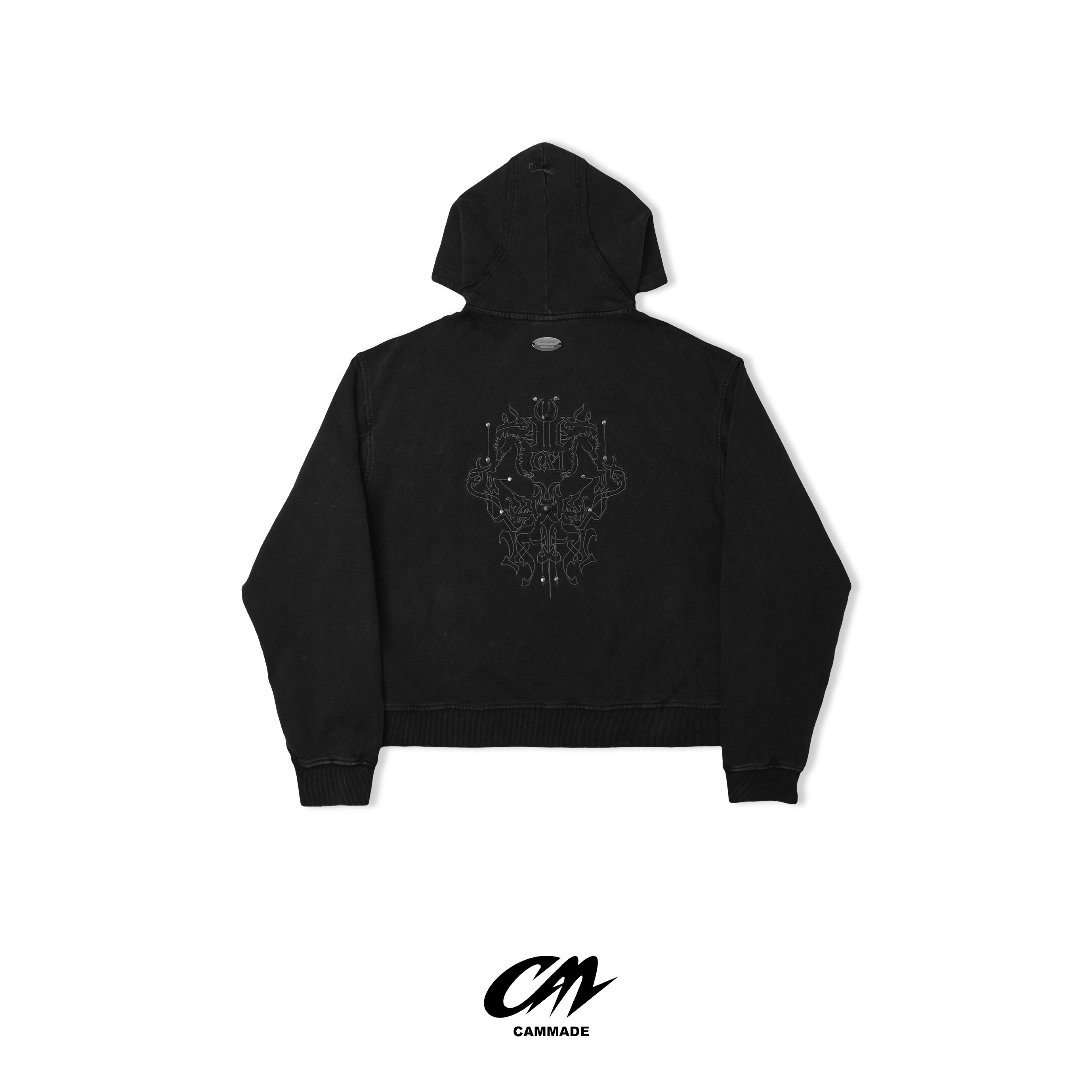 背後的重工刺繡與正面的破骨細節相互呼應,