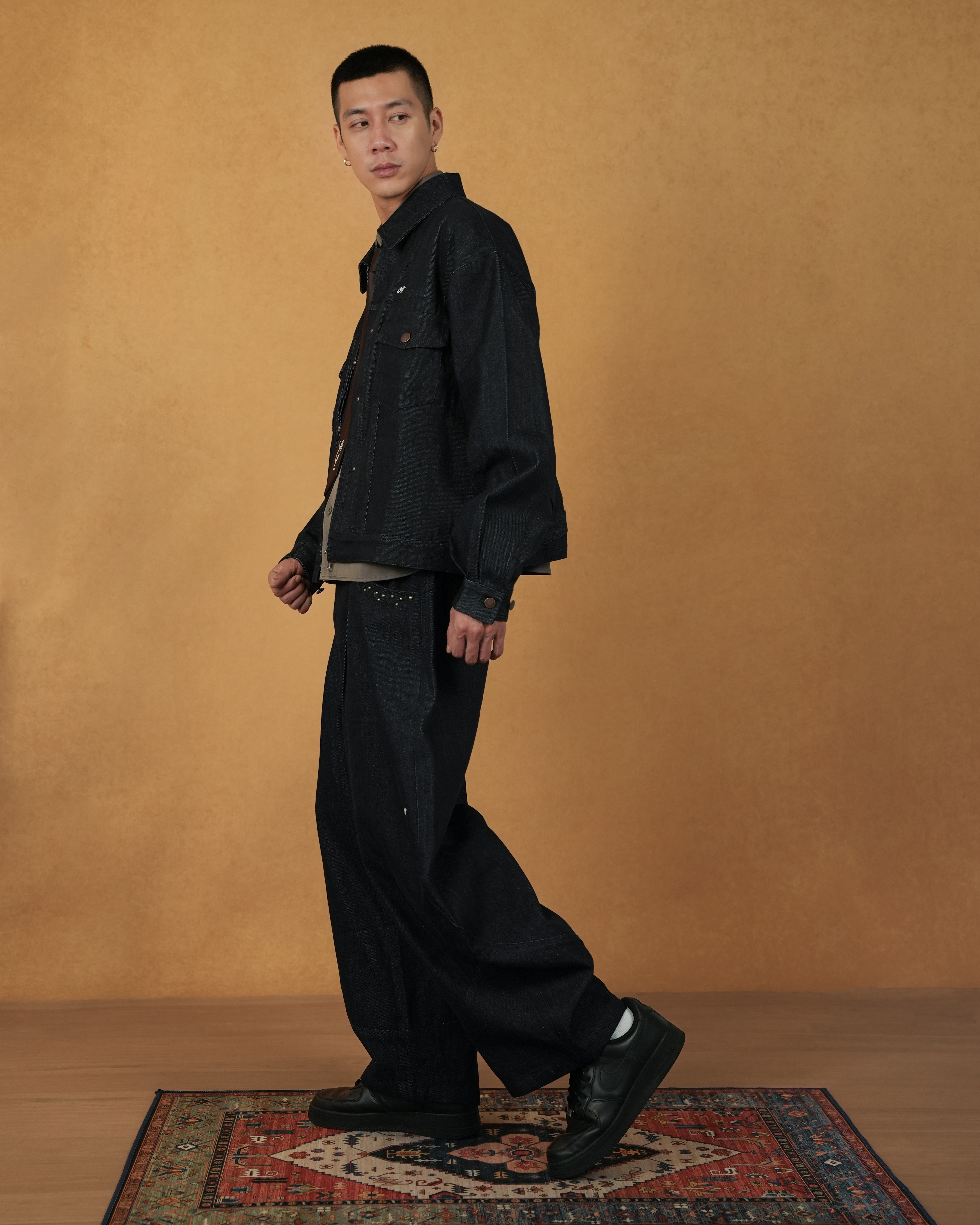 正面的金屬釘釦像是一枚枚工業座標,精準地嵌入深色單寧的肌理中,